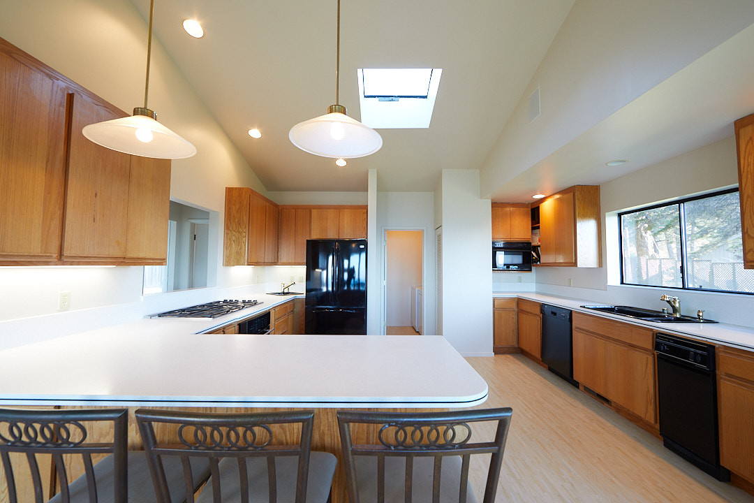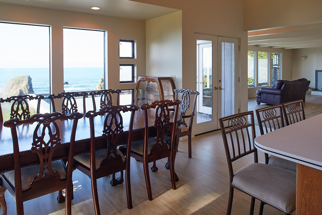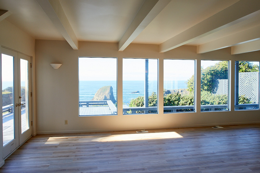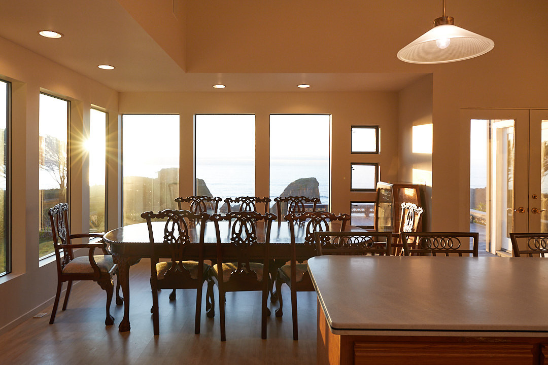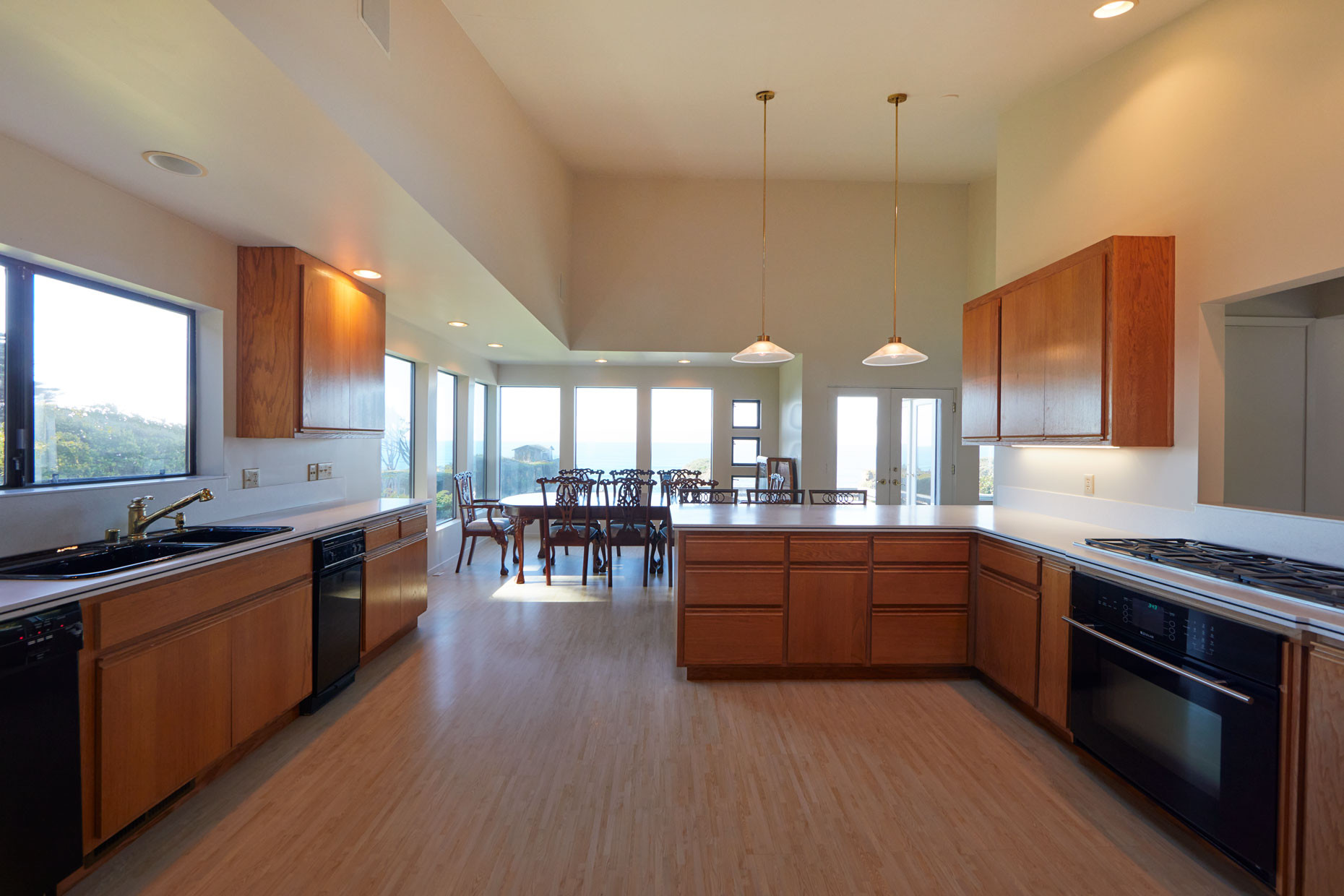 Inside, warm wood finishes, vaulted ceilings, and a flowing, open-concept layout create a sense of calm and connection. The great room, bathed in natural light, centers around panoramic ocean views that shift with every hour and season. Each space — from the primary bedroom to the open kitchen — is designed to celebrate the setting while providing modern comfort and understated luxury.
